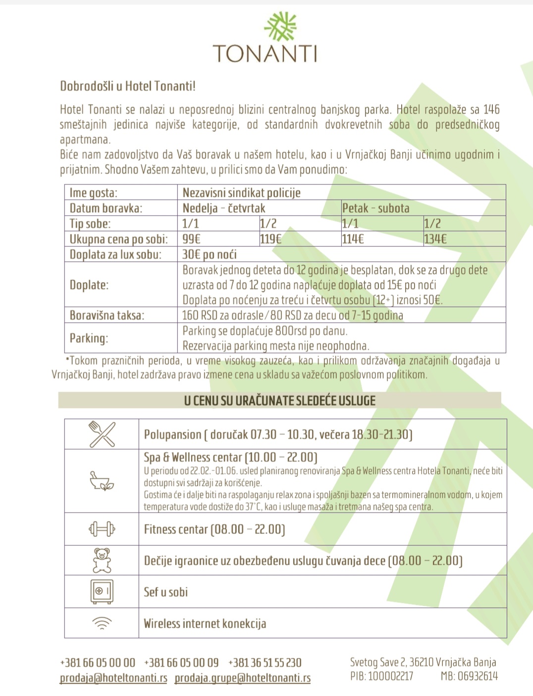 Posebne ponude za članove NSP-a, hotel Tonanti Vrnjačka BanjaNovi cenovnik za 2026 godinu za članove sindikata. 1701 Tweet Print