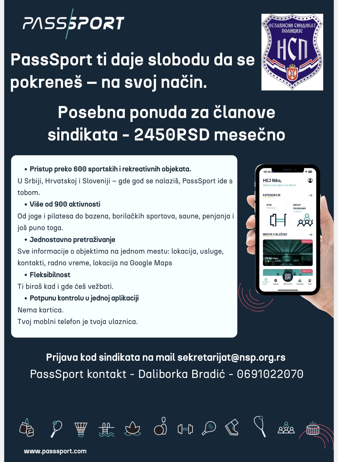 Обавештавамо све чланове Независног синдиката полиције да је обезбеђена посебна погодност у сарадњи са платформом PassSport, која омогућава приступ великом броју спортских и рекреативних садржаја по повлашћеним условима.