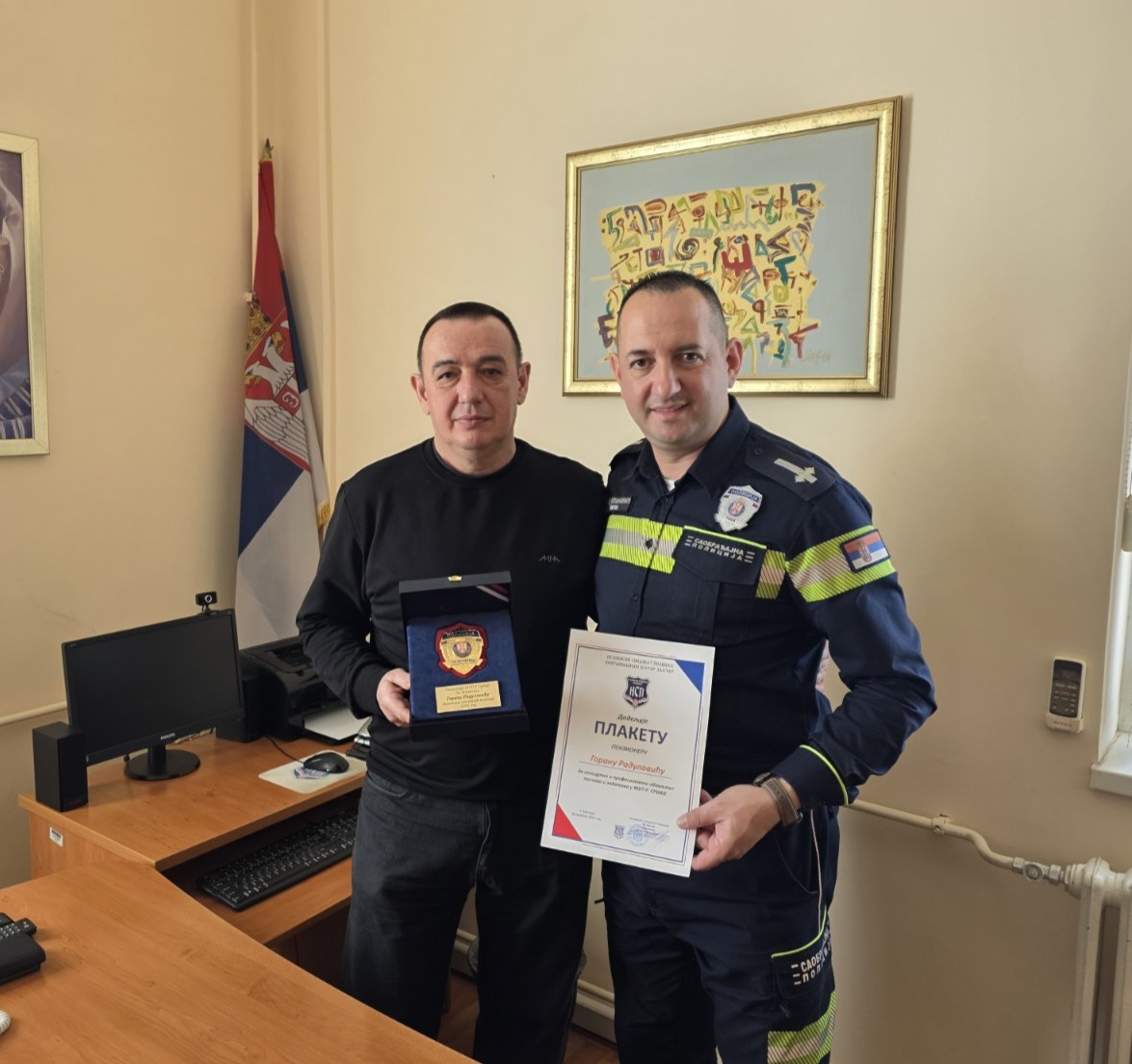 У наставку посете уприличен је и сусрет са пензионисаним колегом Гораном Радуловићем, који је право на старосну пензију стекао крајем 2025. године. Како из оправданих разлога није био у могућности да присуствује свечаном испраћају пензионера у организацији Синдиката, председник Синдикалне групе Књажевац Дејан Севделиновић му је овом приликом свечано уручио плакету као знак поштовања и захвалности за дугогодишњи рад, професионалност и допринос који је оставио у Министарству унутрашњих послова.