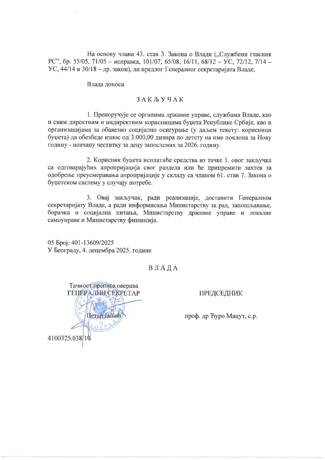 Влада Републике Србије је, на основу члана 43. став 3. Закона о Влади, на предлог Генералног секретаријата Владе, донела Закључак број 401-13609/2025 од 4. децембра 2025. године, којим се препоручује органима државне управе, службама Владе, као и свим директним и индиректним корисницима буџета Републике Србије, укључујући и организације за обавезно социјално осигурање, да обезбеде новчана средства за новогодишњи поклон деци запослених.